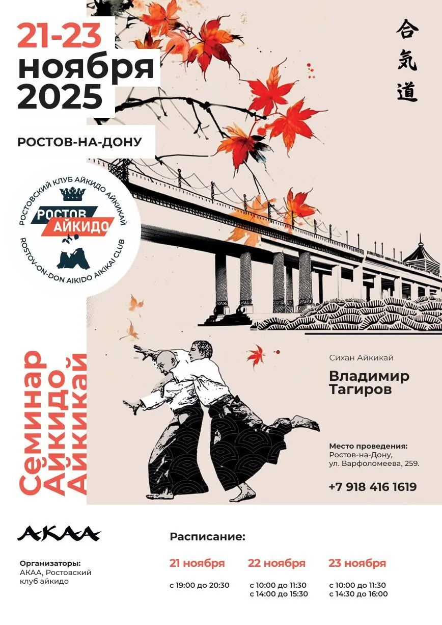 РОСТОВСКИЙ КЛУБ АЙКИДО Приглашает на семинар, который состоится с 21-23 ноября в нашем dojo. Это уникальная возможность углубить свои знания и навыки в этом древнем боевом искусстве под руководством сихана Владимира Тагирова!